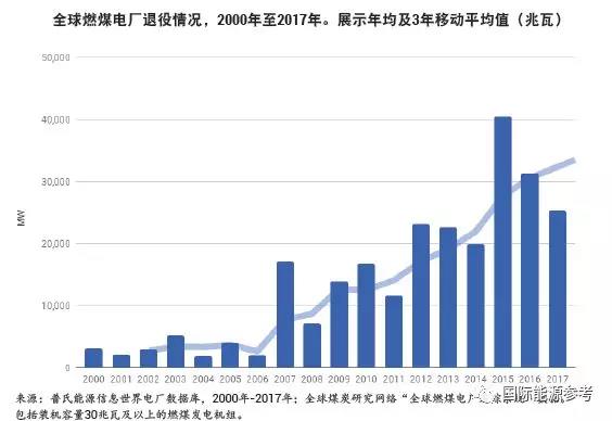 與此同時,過去20年間,全球燃煤機組的退役量出現(xiàn)了大幅的上升。2015年至2017年的三年期間尤為明顯,全球共有約97吉瓦的燃煤機組退役,數(shù)量創(chuàng)歷史新高。其中,美國以45吉瓦、中國以16吉瓦、英國以8吉瓦位居前列。