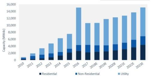 展望未來,GTM和SEIA預測美國太陽能市場將繼續(xù)保持增長,但“直到2023年才能達到我們在2016年看到的令人驚嘆的創(chuàng)紀錄水平?!?
