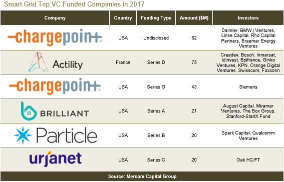 2017年,智能電網(wǎng)領(lǐng)域獲得風(fēng)投資金共計(jì)4.22億美元,涉及交易45個(gè),去年為3.89億美元,涉及交易42個(gè)。