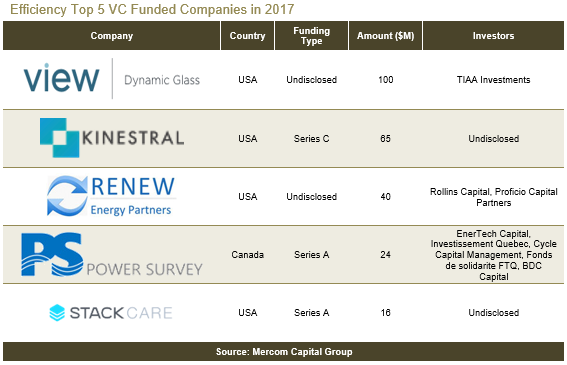 2017年能效領(lǐng)域的風(fēng)險(xiǎn)投資資金從去年的5.28億美元跌至3.84億美元,涉及交易38個(gè)。包括債務(wù)和公共市場(chǎng)融資在內(nèi)的企業(yè)融資總額為33億美元,而2016年則為38億美元。