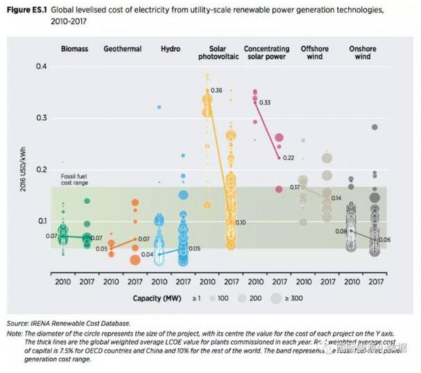 在以上各類可再生能源發(fā)電技術(shù)中,除了水電、地?zé)岚l(fā)電成本上升以外,其他技術(shù)自2010年以來(lái)都有明顯下降,尤其是光伏成本下降超過(guò)70%。IRENA認(rèn)為,風(fēng)電、光伏、光熱成本下降主要源于三個(gè)因素:1)技術(shù)進(jìn)步帶來(lái)的效率提高;2)競(jìng)標(biāo)逐步替代固定上網(wǎng)電價(jià)補(bǔ)貼;3)出現(xiàn)了一批有實(shí)力有經(jīng)驗(yàn)的開(kāi)發(fā)商,開(kāi)發(fā)的項(xiàng)目規(guī)?;?。