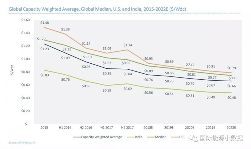 由于供需緊張,2017年下半年美國大型地面光伏項(xiàng)目的投資成本平均為1.14美元/瓦,比上半年的價(jià)格(1.09美元/瓦)略有上升。同樣,在印度2017年上半年的大型地面光伏項(xiàng)目的價(jià)格為0.62美元/瓦,也超過了上半年的平均價(jià)格(0.59美元/瓦)。但是放眼2022年,光伏系統(tǒng)成本會(huì)繼續(xù)下降:GTM預(yù)計(jì)美國的光伏系統(tǒng)投資成本為0.79美元/瓦;印度為0.48美元/瓦,全球加權(quán)平均為0.66美元/瓦。