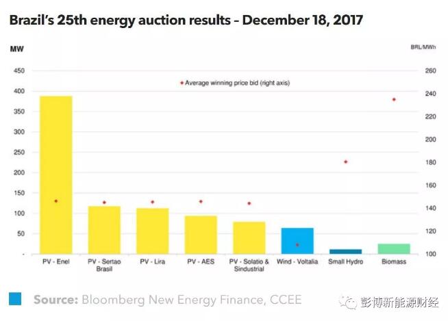 意大利電力企業(yè)和開發(fā)商Enel是本輪拍賣中最大的贏家,共敲定了388MW的光伏項目。此外,其他贏得合同的公司還有:Sertao Brasil(118 MW 光伏)、Lira Empreendimentos(112 MW 光伏)、AES (94 MW 光伏),及Solatio&Sindustrial(79 MW 光伏)。