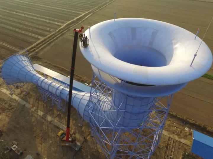 聽(tīng)起來(lái)很厲害的樣子,但是原理卻很簡(jiǎn)單:位于系統(tǒng)最上部的是集風(fēng)口,就像一個(gè)朝天大喇叭,可以收集來(lái)自四面八方的風(fēng),不管是微風(fēng),還是90km風(fēng)速的高風(fēng)都可以穿過(guò)集風(fēng)口進(jìn)入系統(tǒng)內(nèi)部,當(dāng)遇到突然變窄的管道時(shí),高速流動(dòng)的風(fēng)開(kāi)始聚集并加速,最終推動(dòng)渦輪機(jī)將風(fēng)能轉(zhuǎn)化為電能,尾部的擴(kuò)散器再把風(fēng)重歸大自然。