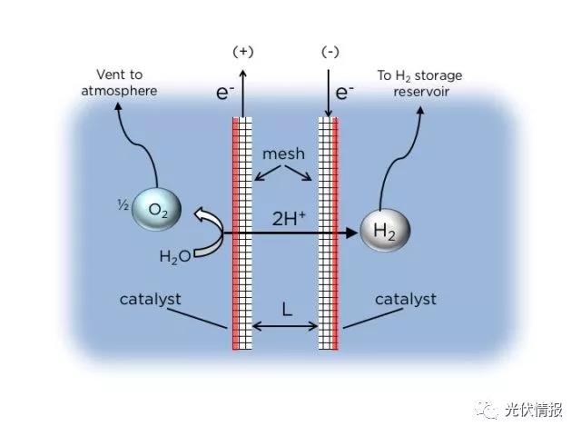 ▲ 不對稱網(wǎng)狀電極示意圖,氧氣和氫氣在不同側生成,氫氣會上升到特定氣體采集室儲存。(Source:哥倫比亞大學)