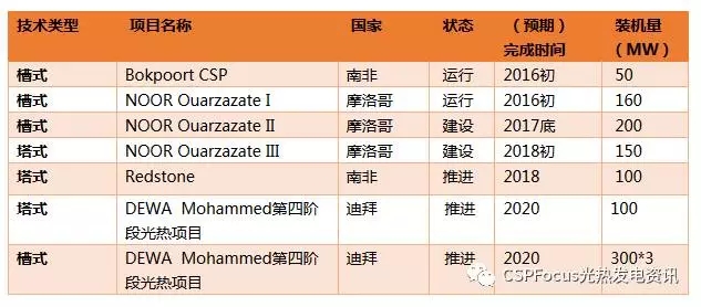 其中,光熱發(fā)電項(xiàng)目包括今年9月宣布中標(biāo)結(jié)果的DEWA(迪拜水電局)700MW光熱電站(ACWA聯(lián)合上海電氣),摩洛哥Noor1&2&3光熱電站群,南非Bokpoort和Redstone光熱電站。