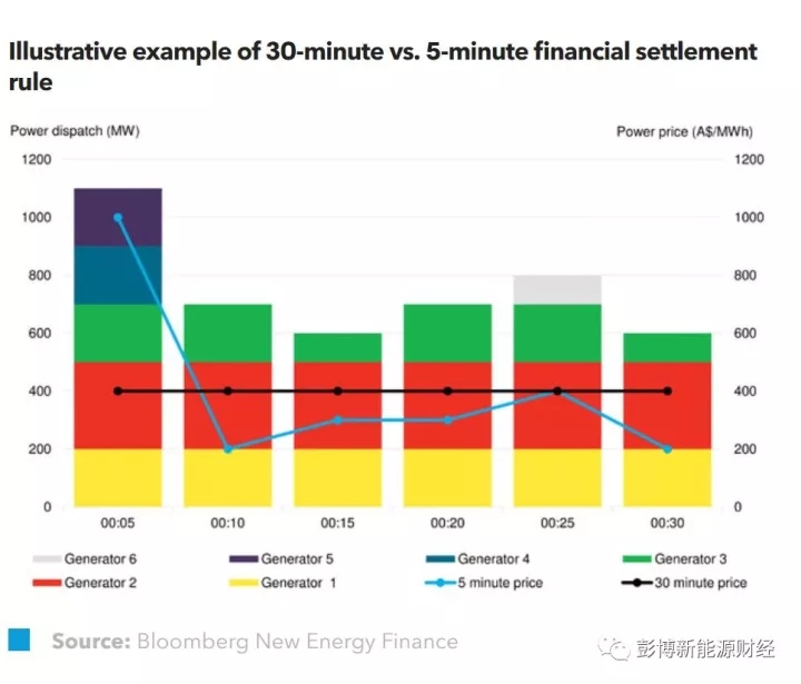 目前,澳大利亞電力系統(tǒng)的實(shí)際電力調(diào)度間隔為5分鐘,但財(cái)務(wù)結(jié)算間隔卻超過30分鐘,也就是說發(fā)電機(jī)組獲得的實(shí)際費(fèi)用為“每30分鐘內(nèi)共6次調(diào)度的平均價(jià)格”(見上圖)。這種結(jié)算機(jī)制并不能有效區(qū)分真正的快速響應(yīng)和較慢的響應(yīng),導(dǎo)致一些在電網(wǎng)需求產(chǎn)生25分鐘后才開始提供響應(yīng)電力的發(fā)電公司也可以拿到不合理的報(bào)酬。