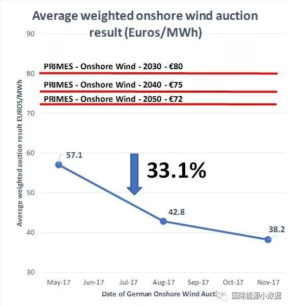 今年5月,德國第一輪陸上風電807兆瓦項目招標的中標企業(yè)平均報價為57.1歐元/兆瓦時;而在8月份第2輪的1吉瓦陸上風電招標中,中標企業(yè)的平均報價為42.8歐元/千瓦時。也就是說,德國陸上風電在過去6個月內成本下降了33%。