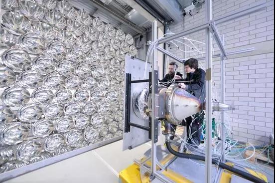 據(jù)德國國家航空航天研究中心(DLR)消息,由149盞短弧氙氣燈組成的Synlight系統(tǒng)已經(jīng)于3月23日正式啟動測試。這堵近14米高、16米寬的“燈墻”,燈光投射到20x20厘米的聚焦平面上,產(chǎn)生的輻射強(qiáng)度是太陽光照射同等面積的1萬倍,溫度最高可達(dá)3000攝氏度,大約是高爐溫度的2到3倍,功率達(dá)350千瓦。