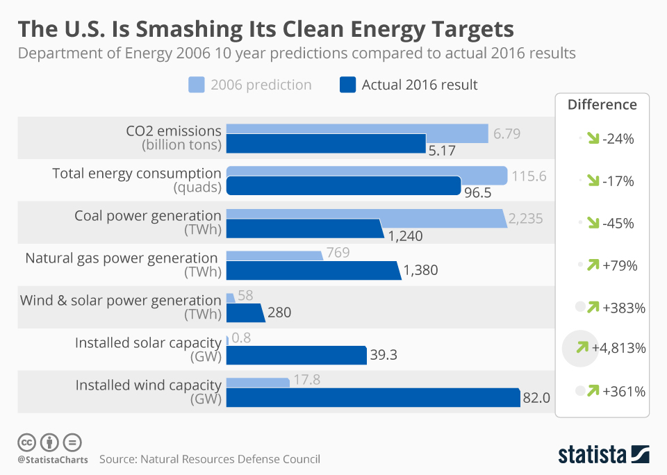 美國(guó)數(shù)據(jù)供應(yīng)商Statista稱,2016年,二氧化碳實(shí)際排放,比十年前的預(yù)期少了24%。煤炭發(fā)電量比預(yù)期的要低45%,而天然氣發(fā)電比預(yù)期的高出79%。