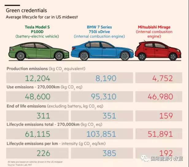 如果與豪華的寶馬7系列(BMW 7 Series)燃油汽車的碳排放(385克/公里)相比,特斯拉Model S的碳排放確實(shí)要低41%。但是,如果與小巧的三菱Mirage燃油汽車的碳排放(192克/公里),那么特斯拉Model S全生命周期的平均碳排放就要高出17%。