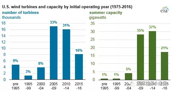 中國(guó)儲(chǔ)能網(wǎng)訊:根據(jù)美國(guó)能源信息署(EIA)的數(shù)據(jù),到2016年底止風(fēng)力發(fā)電裝機(jī)容量約為82吉瓦,其中2%建于2000年以前;5%建于2000-2004年之間;35%建于2005-2009年之間;37%建于2010-2015年之間;21%建于2015-2016年之間。