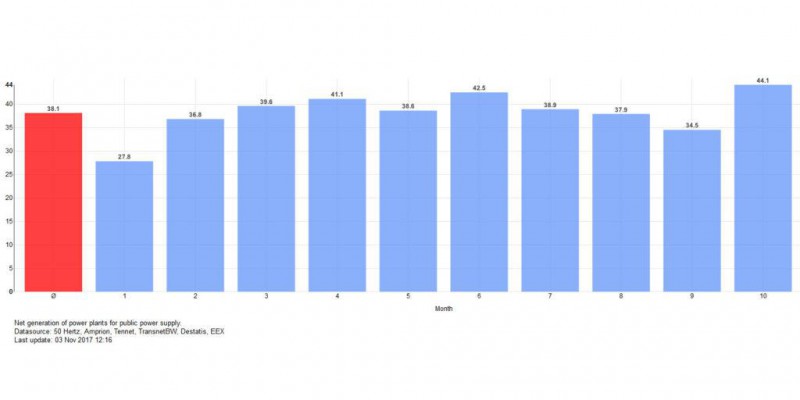 根據安裝在德國太陽能系統(tǒng)研究所(Fraunhofer ISE)的能源圖表(Energy Charts)數(shù)據,10月份風能產量為121.6億千瓦時,而Bruno Burger的分析顯示,當月光伏產電量為23.2億千瓦時,分別相當于該月德國總發(fā)電量的26.8%和5%。10月份可再生能源電力占據了電力總需求量的44.1%。