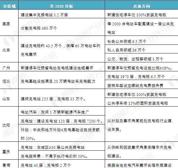 在國(guó)家政策和各省市新能源汽車(chē)產(chǎn)銷(xiāo)量的影響下,國(guó)內(nèi)代表性地區(qū)紛紛制定出到2020年省市充電樁的建設(shè)目標(biāo),從國(guó)家層面至2020年集中建設(shè)交換電樁1.2萬(wàn)座,布局于公共場(chǎng)所等的分散充電樁480萬(wàn)個(gè),其他省市均從電動(dòng)汽車(chē)的推廣、充電樁的建設(shè)和充電服務(wù)費(fèi)角度規(guī)劃充電樁的建設(shè)布局。