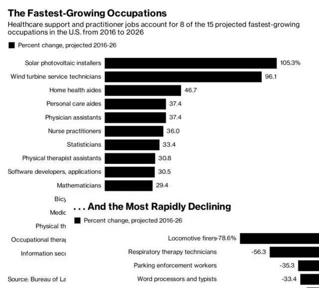 中國儲(chǔ)能網(wǎng)訊:據(jù)美國勞工部預(yù)測,2016-2026年間美國增長最快的工作崗位是光伏系統(tǒng)安裝工(+105%)。2016年光伏系統(tǒng)安裝工的工資中位線為39,240美元,預(yù)計(jì)2026年工資水平加倍。除了光伏安裝以外,其次是風(fēng)機(jī)技工也將大幅增長(+96%)。此外家庭健康護(hù)工、醫(yī)生助理、護(hù)士等崗位也有30%到46%的成長空間。值得注意的是,數(shù)學(xué)家、自行車修理工的崗位也將在未來10年增長29%。