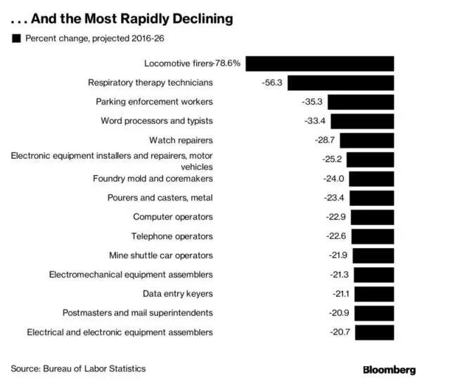 2016-2026年下述職業(yè)的工作機(jī)會(huì)將面臨縮水:火車操作工(-79%)、呼吸療法技術(shù)員(-56%)、停車場看護(hù)員(-35%)、打字員(-33%)、修表工人(-29%)。
