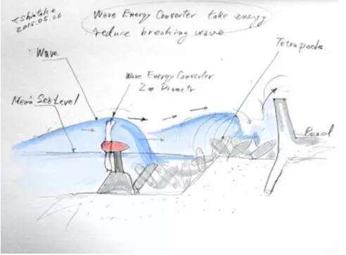 而日本的波浪能量轉(zhuǎn)換系統(tǒng)(Wave Energy Converter,WEC)則和防波堤用四腳錐體塊并肩作戰(zhàn),這些渦輪機(jī)放置在第一火線上,比如四腳錐體塊的前方或是珊瑚礁地形。由于從深海涌上淺海珊瑚礁的波浪會(huì)因“斷裂”產(chǎn)生極快速水流,渦輪機(jī)便在收集海浪能量的同時(shí)抵消浪潮直接沖擊岸邊的力道,減少日本沿岸受到的影響。