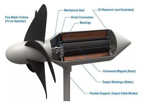 渦輪機(jī)本身設(shè)計(jì)成能承受極端海浪和惡劣天氣(比如臺(tái)風(fēng)),就像一朵花,直徑為70公分的5條旋轉(zhuǎn)葉片由柔軟材料制成,旋轉(zhuǎn)速度慢到足夠讓不小心被葉片掃過的海洋生物逃脫不受傷,支架結(jié)構(gòu)也靈活彎曲,以避免它們在大浪之下“剛極必折”。研究團(tuán)隊(duì)估計(jì),渦輪機(jī)的使用壽命長達(dá)10年。