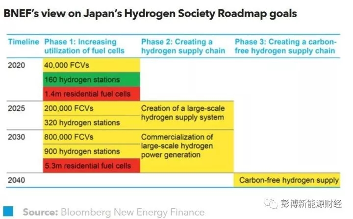 具體來(lái)看,日本的“氫氣社會(huì)發(fā)展路線圖”共有三個(gè)主要發(fā)展方向,分別為居民住宅燃料電池;燃料電池汽車及相應(yīng)加氫基礎(chǔ)設(shè)施;以及無(wú)碳化全球氫能供應(yīng)鏈。在“線路圖”中,日本政府已經(jīng)為該國(guó)住宅燃料電池和燃料電池汽車的發(fā)展制定了具體的2020、2025 和 2030 年分階段目標(biāo);并為氫能供應(yīng)鏈的建設(shè)制定了2040 年的定性目標(biāo)。