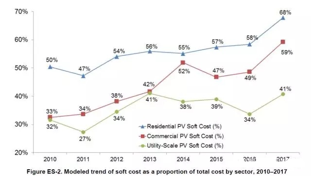以公共事業(yè)級(大型地面)光伏為例,2010年軟成本只占總成本的32%,而2017年軟成本占到總成本的41%。2017年商用設(shè)施光伏系統(tǒng)的軟成本占59%,而家庭戶用光伏的軟成本比例更高達(dá)68%。