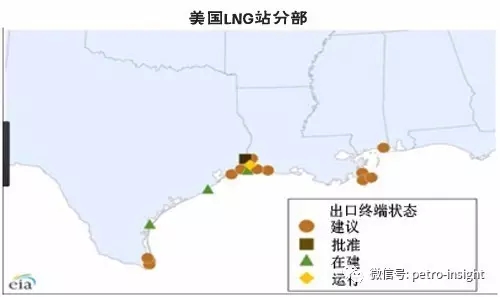預(yù)計(jì)至2019年底,美國將另有四個(gè)LNG出口終端開始運(yùn)行。Cameron LNG公司正在路易斯安那州建設(shè)一個(gè)終端,預(yù)計(jì)2018年開始運(yùn)行;Freeport LNG公司在得克薩斯州的終端將于2018年開始運(yùn)行;Cove Point公司位于馬里蘭州的終端將于2017年底前開始運(yùn)行;切尼爾公司的Corpus Christi終端將于2019年開始運(yùn)行。