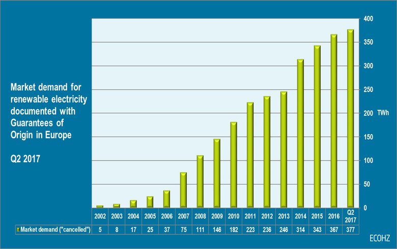 中國(guó)儲(chǔ)能網(wǎng)訊:根據(jù)歐洲發(fā)行機(jī)構(gòu)協(xié)會(huì)的數(shù)據(jù),2017年二季度,歐洲綠色電力需求同比激增39%。