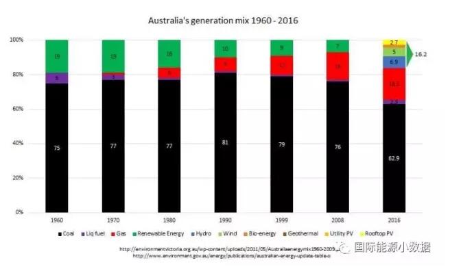 中國儲(chǔ)能網(wǎng)訊:根據(jù)澳大利亞政府環(huán)境和能源部的統(tǒng)計(jì)數(shù)字,2016年澳大利亞的發(fā)電量中仍有62.9%來自煤電,18.5%天然氣發(fā)電,2.3%為燃油發(fā)電,可再生能源比例為16.2%(其中6.9%水電、5%風(fēng)電、2.7%屋頂光伏)。相比之下,1960-1970年之間,澳大利亞可再生能源發(fā)電比例曾達(dá)到19%;1980年可再生能源發(fā)電比例為16%,與2016年相仿。
