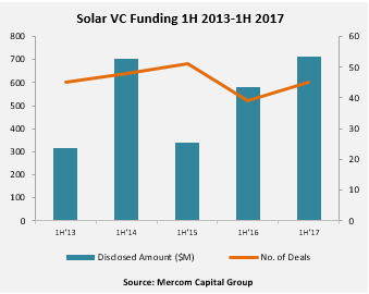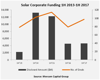 中國儲能網(wǎng)訊:Mercom資本集團(tuán)日前發(fā)布半年度太陽能行業(yè)報告稱,2017年上半年,太陽能企業(yè)融資(包括風(fēng)投資金、公共市場和債務(wù)融資)小幅上升2.2%至46億美元,累計交易97個,去年同期為79個。