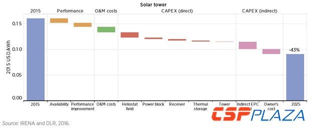 圖:塔式光熱電站2025年之前的成本下降曲線(數(shù)據(jù)來自IRENA 2016年發(fā)布的報告)