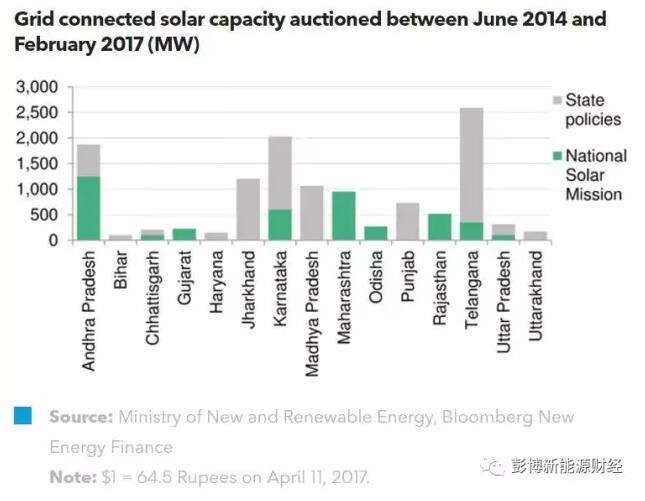 印度的光伏價(jià)格正在持續(xù)下降。2016年的最低光伏電價(jià)為每度電4.34盧比(折合$64.1perMWh)。2017年2月,光伏電價(jià)繼續(xù)下跌至每度電3.31盧比(折合$49.38perMWh)。2017年4月11日,Engie公司甚至創(chuàng)下了每度電3.15盧比(折合$48.48perMWh)的光伏電價(jià)新低。