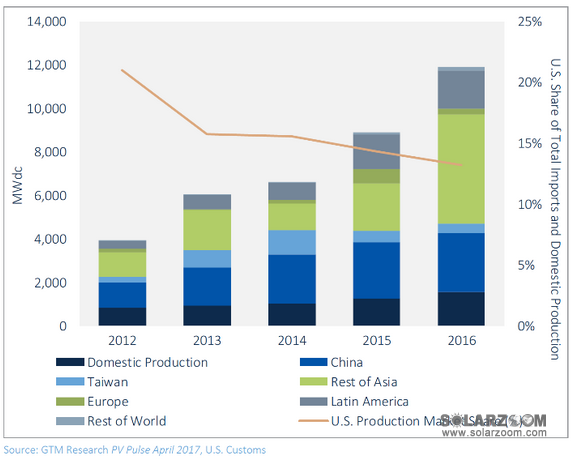 但Suniva認(rèn)為,這一申請將會成功遏制美國太陽能公司裁員、破產(chǎn)的頹勢。數(shù)據(jù)顯示,目前美國太陽能公司的市場份額在不斷縮減。