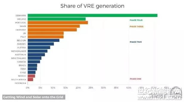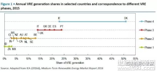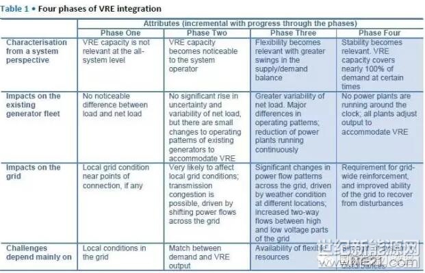 國際能源署發(fā)布報告Getting Wind and Sun onto the Grid,按照電網(wǎng)吸納間歇性可再生能源(主要是風(fēng)電、光伏)的比例劃分了4個階段:
