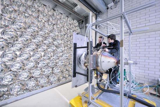 據(jù)德國國家航空航天研究中心(DLR)消息,由149盞短弧氙氣燈組成的Synlight系統(tǒng)已經(jīng)于3月23日正式啟動測試。這堵近14米高、16米寬的“燈墻”,燈光投射到20x20厘米的聚焦平面上,產(chǎn)生的輻射強(qiáng)度是太陽光照射同等面積的1萬倍,溫度最高可達(dá)3000攝氏度,大約是高爐溫度的2到3倍,功率達(dá)350千瓦。