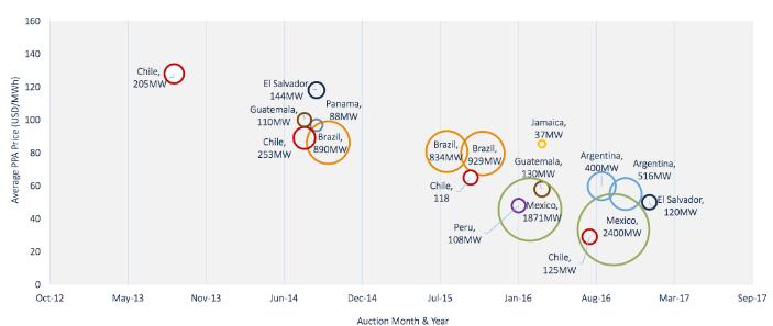 2016年下半年,智利太陽能拍賣價格降至29美元/每兆瓦時,不僅創(chuàng)造了拉丁美洲新低,而且也是全球范圍的最低價格。