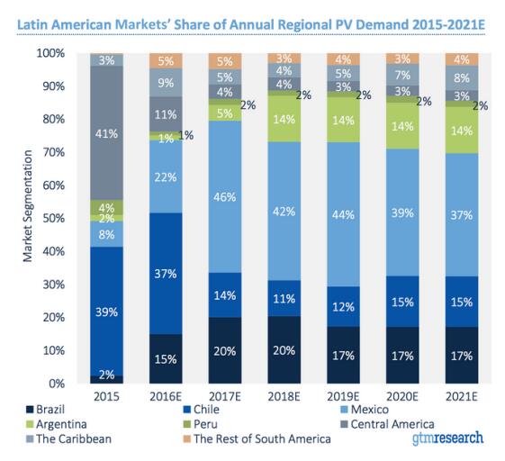 盡管去年遭遇了政治和經(jīng)濟風暴,巴西仍控制拉丁美洲光伏需求前五大份額。太陽能分析師MananParikh表示,巴西光伏市場在2016年增加了267MW,如果近期經(jīng)濟和需求再不復蘇,那它將很快失去相對鄰國的優(yōu)勢地位。
