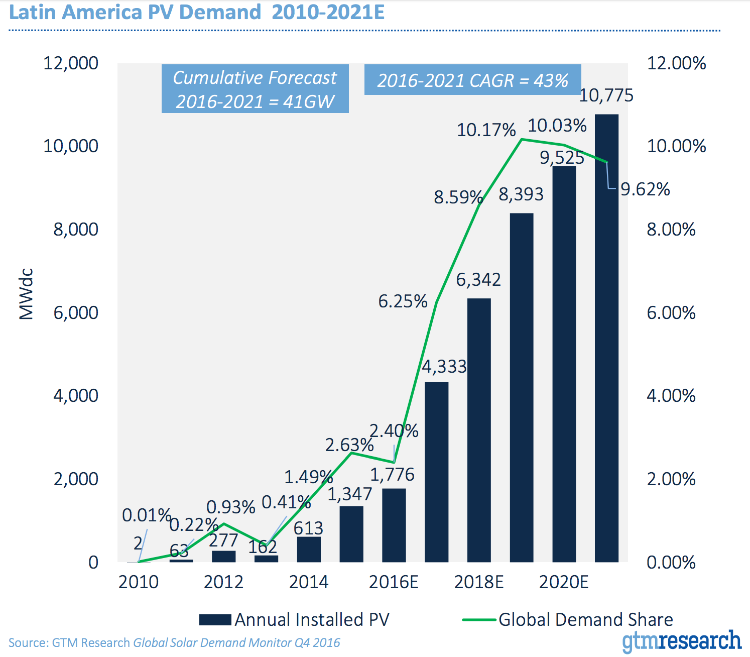 中國儲能網(wǎng)訊:根據(jù)全球調研公司GTM Research關于拉丁美洲光伏市場的最新報告,雖然2010年幾乎沒有太陽能裝機,但是到2021年,該地區(qū)的太陽能裝機容量將超過40GW。