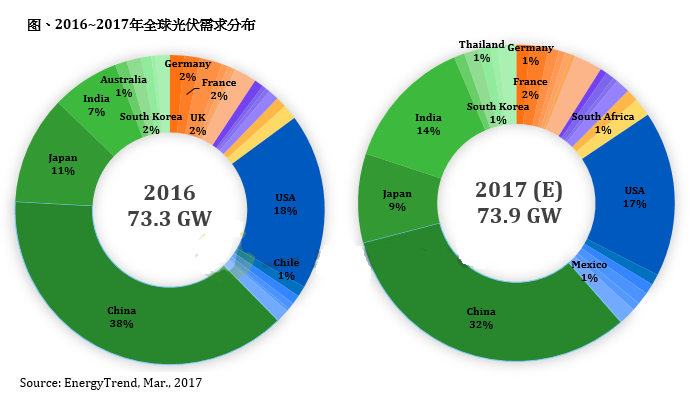 EnergyTrend分析師蔡旻純表示,由于中國目前公布之2017年光伏裝機目標略低于去年,加上美國政策恐不利于光伏發(fā)展、日本躉購費率(Feed-in-Tariff)持續(xù)下調(diào)等因素,讓需求強勁成長中的印度有望取代日本成為需求第三大國,占全球比重達14%。