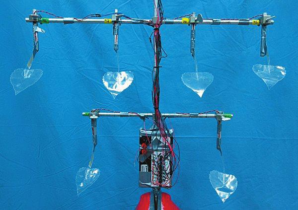 McCloskey實(shí)驗(yàn)室的仿生樹風(fēng)力發(fā)電裝置的原型不是真的樹,而是將十二個(gè)楊樹葉形狀的塑料皮瓣掛在 一個(gè)金屬棚架上,其莖葉內(nèi)有小型特殊塑料條,當(dāng)它被流動(dòng)的空氣彎曲時(shí),可以釋放出電荷,這個(gè)過(guò)程被稱為壓電效應(yīng)。將楊樹葉子作為藍(lán)本是因?yàn)槠浔馄降娜~柄可以迫使葉片規(guī)律地振蕩,通過(guò)柔性壓電片,充分利用風(fēng)能,優(yōu)化發(fā)電效率。