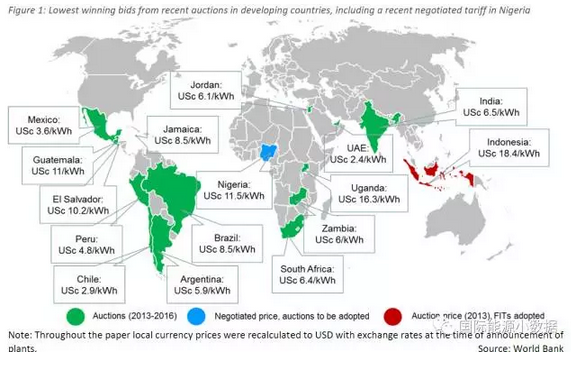 中國儲(chǔ)能網(wǎng)訊:根據(jù)世界銀行一項(xiàng)研究,2013-2016年間發(fā)展中國家的光伏項(xiàng)目競標(biāo)最低報(bào)價(jià)差別很大。