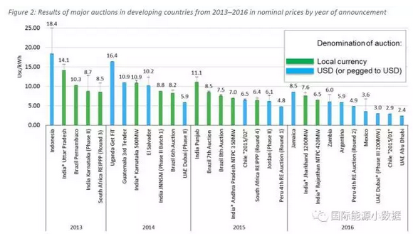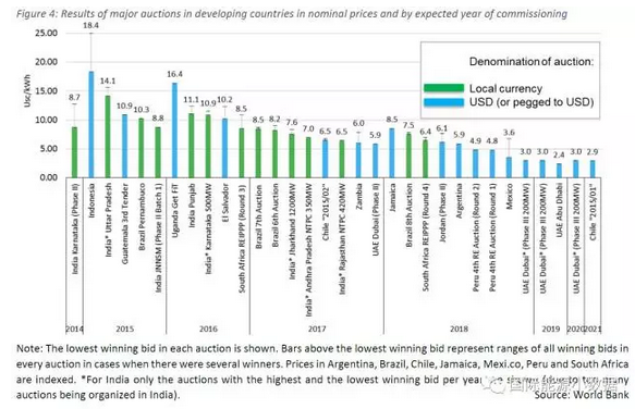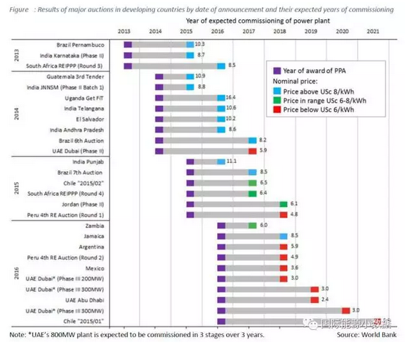 印度尼西亞的報(bào)價(jià)高達(dá)18.4美分/千瓦時(shí),烏干達(dá)16.3美分/千瓦時(shí),尼日利亞11.5美分/千瓦時(shí),薩爾瓦多10.2美分/千瓦時(shí)。最低報(bào)價(jià)在5-10美分/千瓦時(shí)之間的有阿根廷(5.9)、贊比亞(6.0)、約旦(6.1)、南非(6.4)、印度(6.5)、牙買加(8.5)、巴西(8.5);最低報(bào)價(jià)在5美分/千瓦時(shí)以下的有秘魯(4.8)、墨西哥(3.6)、智利(2.9)、阿聯(lián)酋(2.4)。2016年以來的報(bào)價(jià)已經(jīng)全部都低于10美分/千瓦時(shí)。