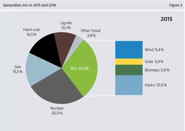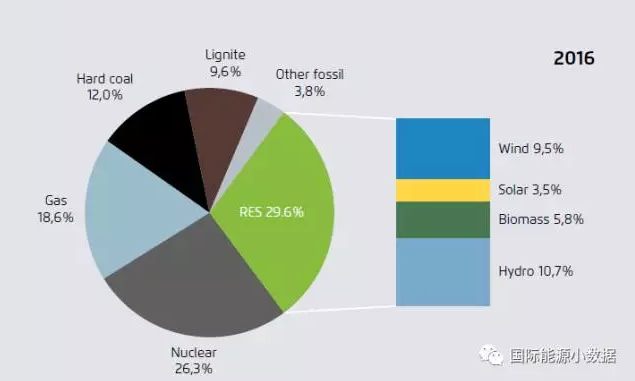 如果把各類可再生能源(水電、風(fēng)電、生物質(zhì)、太陽(yáng)能)整體計(jì)算,2016年在歐盟發(fā)電總量中占比為29.6%,比2015年(29.2%)略有上升,顯示歐盟可再生能源發(fā)展進(jìn)入了瓶頸期。