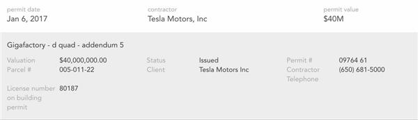 作為一家施工許可證追蹤及承包商網(wǎng)站,Buildzoom去年向特斯拉發(fā)布了9份施工許可證,他們展示了部分重大的新項目,其中數(shù)個項目涉及金額巨大。Buildzoom的杰克·庫克森(Jack Cookson)稱,10.3億的施工價值的大部分在于對退出許可的變動。