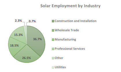 同一份報告指出,所有太陽能業(yè)者當中,有36.7%是施工與安裝人員、26.5%是市場銷售人員、18.5%是制造業(yè)者、15.3%是專業(yè)服務人員,另外有3%是其他相關工作。由此來看,太陽能發(fā)電業(yè)為美國創(chuàng)造了可觀的就業(yè)數字,且主要是由新的太陽能系統建置需求所帶動。
