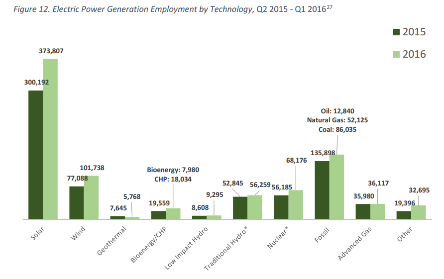 在DOE所發(fā)表的《美國能源與就業(yè)報告》(U.S. Energy and Employment Report)中,統計數據顯示,美國在2016年第一季末時的太陽能發(fā)電業(yè)相關業(yè)者達到374,000人,是所有能源業(yè)當中最多的,占了43%;這個數字也較前一年度成長了25%。風電行業(yè)從業(yè)人數有101,738人,較上年同期增加32%。