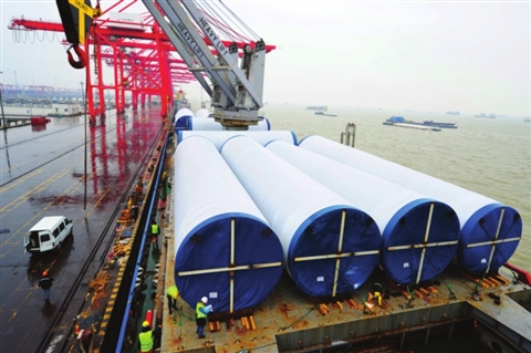 中國儲能網訊:近日,滿載著4根32段風電塔筒的長航寧海輪在江蘇省太倉港集裝箱碼頭完成吊裝,經由太倉港出口泰國林查班港。由南京中建五洲工程裝備有限公司制造的風力發(fā)電塔筒去年中標總裝機容量67.5MW的泰國GNP風電塔筒制造項目,選用18臺Gamesa G1142.0MW和15臺2.1MW機型,單套重量達512噸,輪轂高度達153米,系亞洲目前最高的風力發(fā)電塔筒。