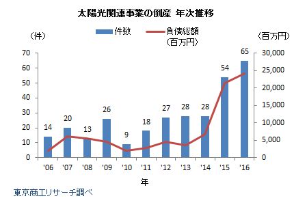 日本調(diào)研機(jī)構(gòu)東京商工Research發(fā)表2016年太陽能發(fā)電相關(guān)企業(yè)的調(diào)查報告,顯示去年有65家相關(guān)企業(yè)倒閉,較2015年增加了20.4%,數(shù)量是自2000年展開調(diào)查之后的新高。不僅如此,總負(fù)債額與大規(guī)模破產(chǎn)的數(shù)量也都是歷年最高。