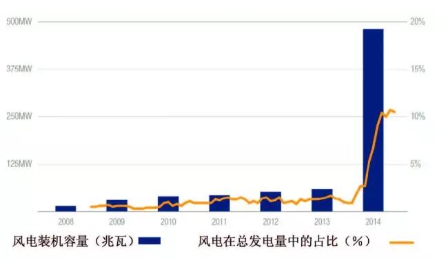 烏拉圭的改革為進一步快速擴大風電投資提供了穩(wěn)定的政策環(huán)境和相關(guān)的技術(shù)經(jīng)驗,該國目前每年在清潔能源開發(fā)方面獲得的投資額超過了十億美元。隨著風電的快速發(fā)展,該國正在不斷突破預(yù)定目標。烏拉圭政府原計劃于2015 年使風電裝機容量達到30 萬千瓦,但由于實際發(fā)展好于預(yù)期,最終的裝機容量達到了50 萬千瓦。現(xiàn)如今,烏拉圭的目標是在2017年前使風電在全國總電力中的占比達到38%,這將是目前份額的兩倍多。