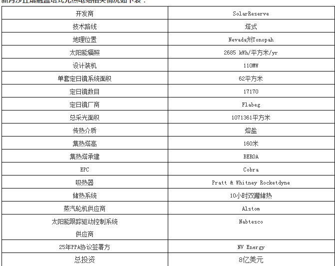 據(jù)悉,新月沙丘電站總投資額8億美元,曾獲得美國能源部提供的7.37億美元貸款擔(dān)保支持。SolarReserve、ACS Cobra和Santander銀行參與了部分項目投資。內(nèi)華達州最大的電力公司NV Energy公司為該電站的電力承購方,PPA協(xié)議購電年限為25年,協(xié)議電價僅為0.135美元/KWh。