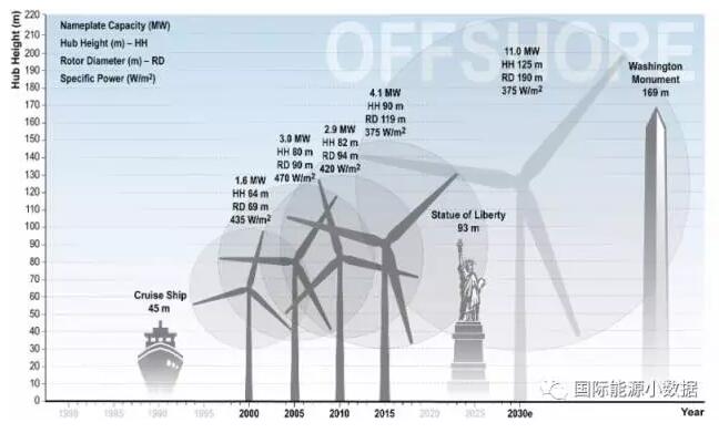 預(yù)計2030年,裝機(jī)容量可達(dá)11兆瓦,輪轂高度到125米,風(fēng)輪直徑達(dá)190米,而比風(fēng)功率保持在375瓦/平方米。