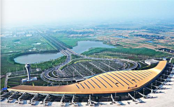 合肥新橋機(jī)場(chǎng)在2013年5月30日正式啟用,屋面采用金黃色的直立鎖邊鋁鎂錳合金面板,規(guī)律設(shè)置19排屋面采光天窗。俯視整個(gè)建筑,宛若金色的展翅大鵬在江淮分水嶺上昂首欲飛,既是一張代表合肥形象的新“名片”,也是安徽又一標(biāo)志性新景觀。該機(jī)場(chǎng)分布式光伏發(fā)電項(xiàng)目貫徹節(jié)能減排理念,在優(yōu)化能源系統(tǒng)運(yùn)行效率的同時(shí),有效推動(dòng)了合肥市“中國(guó)光伏應(yīng)用第一城”的構(gòu)建,促進(jìn)我國(guó)“綠色機(jī)場(chǎng)”的可持續(xù)發(fā)展。